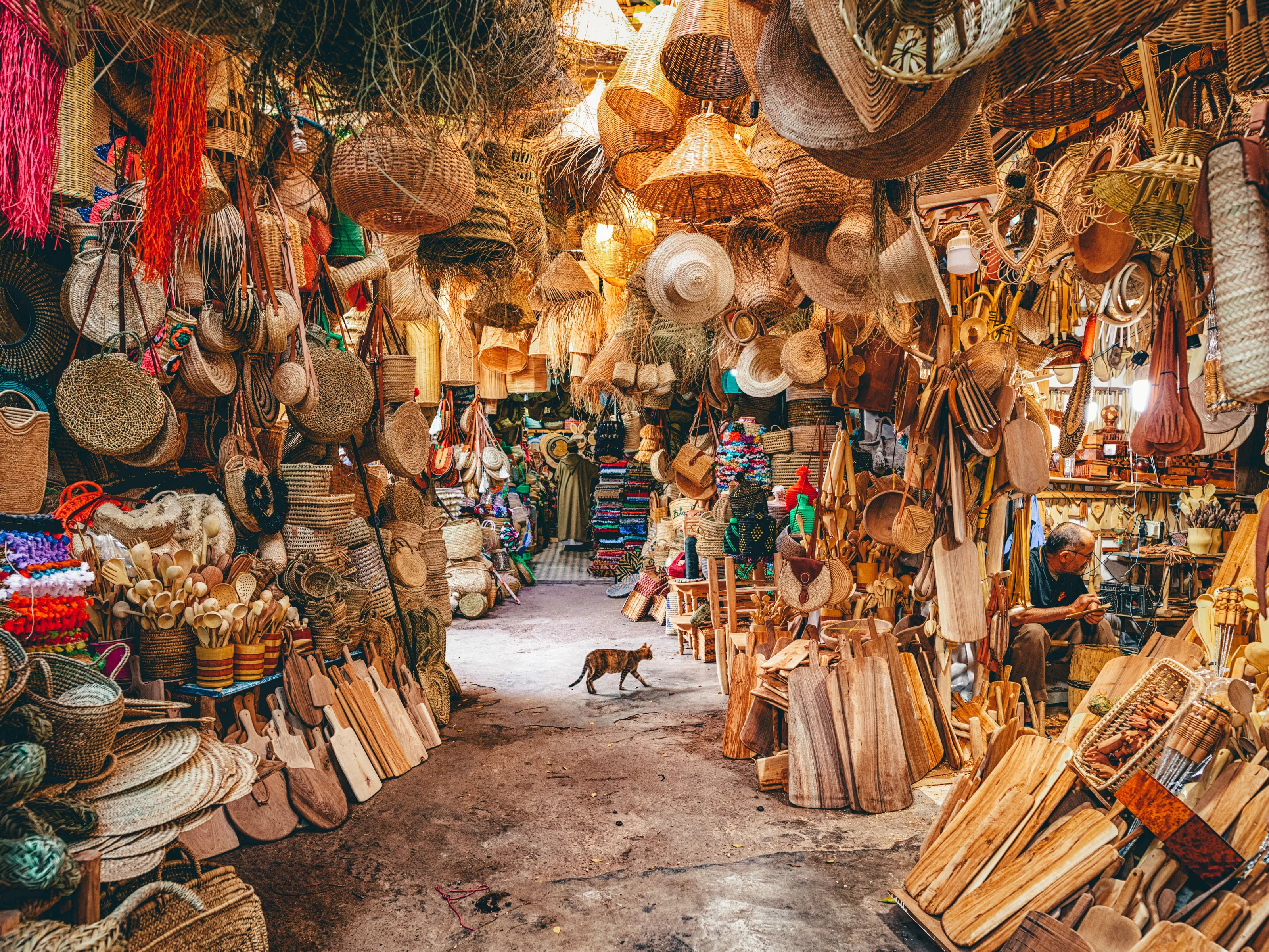 Labirinte iš dengtų turgų į šiaurę nuo Jemaa el-Fnaa parduodama viskas, nuo kilimų ir žibintų iki prieskonių ir odos gaminių. Skirtingi turgūs specializuojasi: Souk Smata (babouche šlepetės), Souk Attarine (prieskoniai), Souk Haddadine (metalo dirbiniai). Derėtis yra privaloma; pradėkite nuo 30–50 % prašomos kainos ir būkite pasirengę pasitraukti. Pasamdykite oficialų gidą (MAD, 200–300 už pusę dienos), kuris padės susiorientuoti ir versti, arba pasinerkite į pasiklydimo malonumą – tai dalis patirties. Eikite ryte (9–11 val.), kai temperatūra yra žemesnė ir parduotuvės tik atsidaro.